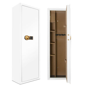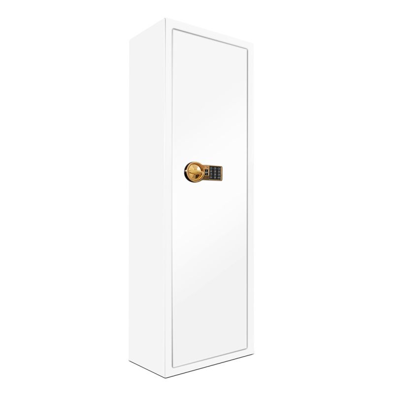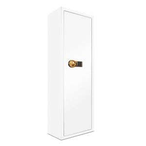 Сейфът осигурява висока сигурност и надеждна защита благодарение на електронната сейфова брава PS 310 по клас А EN 1300, която гарантира контрол на достъпа и устойчивост на манипулации. Здравата стоманена конструкция с врата от 6 мм и стени от 3 мм осигурява стабилност и защита срещу взлом. Оборудван е с вътрешно касово отделение, допълнителни рафтове и специални фабрични отвори за фиксиране към под и стена, осигуряващи висока устойчивост при опит за изнасяне или разбиване. Външното покритие в елегантен бял металик и вътрешното флок покритие в кафяв цвят придават стилен и премиум вид, а златното покритие на клавиатурата и ригелите подчертава високия клас на изделието. Сейфът предлага вместимост за до 4 пушки и разполага с три рафта за организирано подреждане на оръжия и аксесоари.Гаранция – 2 години. Предлага се по заявка, след пълно предплащане.