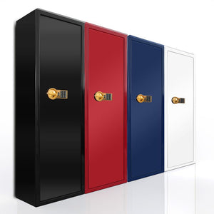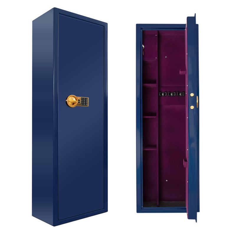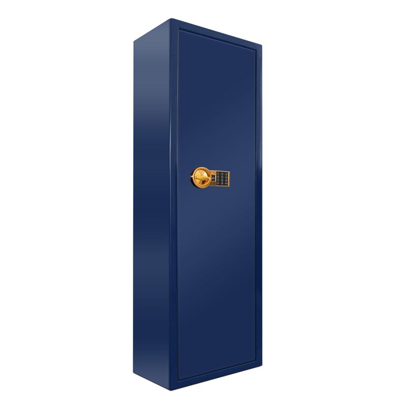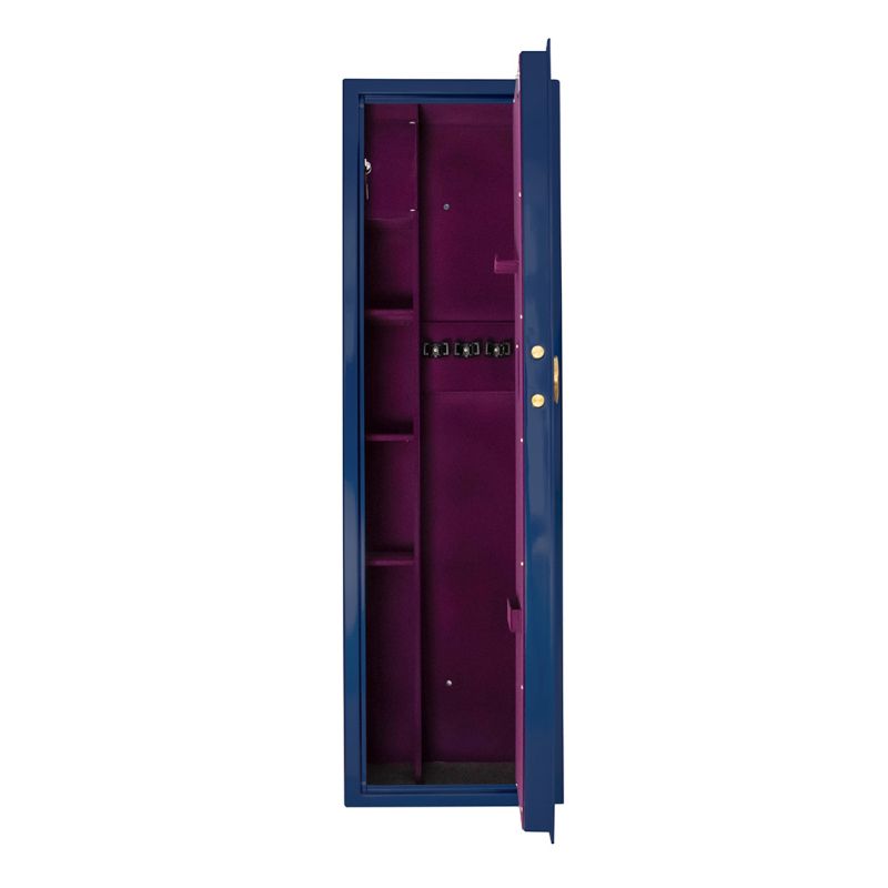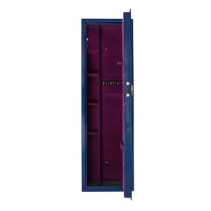 Сейфът осигурява висока сигурност и надеждна защита благодарение на електронната сейфова брава PS 310 по клас А EN 1300, която гарантира контрол на достъпа и устойчивост на манипулации. Здравата стоманена конструкция с врата от 6 мм и стени от 3 мм осигурява стабилност и защита срещу взлом. Оборудван е с вътрешно касово отделение, допълнителни рафтове и специални фабрични отвори за фиксиране към под и стена, осигуряващи висока устойчивост при опит за изнасяне или разбиване. Външното покритие в елегантен СИН МЕТАЛИК и вътрешното флок покритие в лилав цвят придават стилен и премиум вид, а златното покритие на клавиатурата и ригелите подчертава високия клас на изделието. Сейфът предлага вместимост за до 4 пушки и разполага с три рафта за организирано подреждане на оръжия и аксесоари.Гаранция – 2 години. Предлага се по заявка, след пълно предплащане.