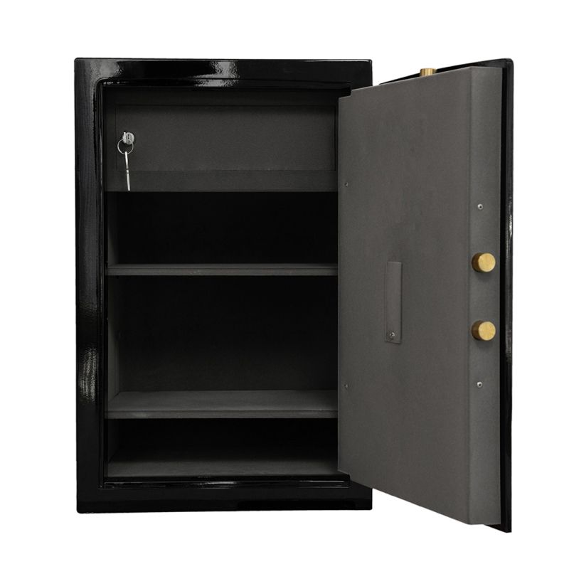 Сейфът осигурява висока сигурност, надеждна защита и устойчивост на взлом по европейски стандарт EN 1143-1 клас 1, гарантирайки спокойствие при съхранението на документи, ценности и пари. Здравата конструкция с дебела стоманена врата 59 мм и стени 25 мм, в комбинация с двоен корпус със специална защита против рязане и разбиване, осигуряват стабилност и дълготрайна издръжливост. Тристранното заключване и електронната сейфова брава PS 310 клас B по EN 1300 предоставят надеждна защита и контрол на достъпа. Скрити панти и фабричен отвор за фиксиране към основа допълнително повишават сигурността срещу опити за изнасяне или взлом. Вътрешното касово отделение добавя още едно ниво на защита за най-ценните вещи. Премиум външен вид благодарение на лаково покритие в цвят черен металик, флок вътрешност в сиво и златно покритие на клавиатурата и ригелите. Гаранция – 2 години.Предлага се по заявка, след пълно предплащане.