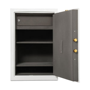 Сейфът осигурява висока сигурност, надеждна защита и устойчивост на взлом по европейски стандарт EN 1143-1 клас 1, гарантирайки спокойствие при съхранението на документи, ценности и пари. Здравата конструкция с дебела стоманена врата 59 мм и стени 25 мм, в комбинация с двоен корпус със специална защита против рязане и разбиване, осигуряват стабилност и дълготрайна издръжливост. Тристранното заключване и електронната сейфова брава PS 310 клас B по EN 1300 предоставят надеждна защита и контрол на достъпа. Скрити панти и фабричен отвор за фиксиране към основа допълнително повишават сигурността срещу опити за изнасяне или взлом. Вътрешното касово отделение добавя още едно ниво на защита за най-ценните вещи. Премиум външен вид благодарение на лаково покритие в цвят БЯЛ металик, флок вътрешност в сиво и златно покритие на клавиатурата и ригелите. Гаранция – 2 години.Предлага се по заявка, след пълно предплащане.