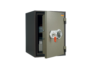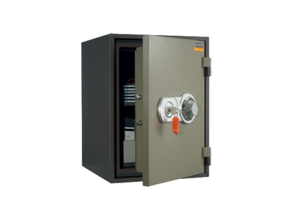 Предназначен е за съхранение на ценности и документи от пожар, тъй като е с пожар резистентност S 60P. Кутията и вратата на сейфа са двустенни с пълнеж от огнеупорен бетон.Сейфът е с прахово полимерно покритие. Заключването е тристранно заключване посредством две брави - с ключ и шифрова ключалка с постоянен код.Сейфът е снабден със сертификат за пожароустойчивост.Сейфът има само един отвор за монтаж към под.