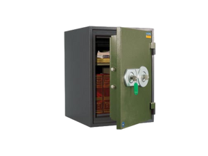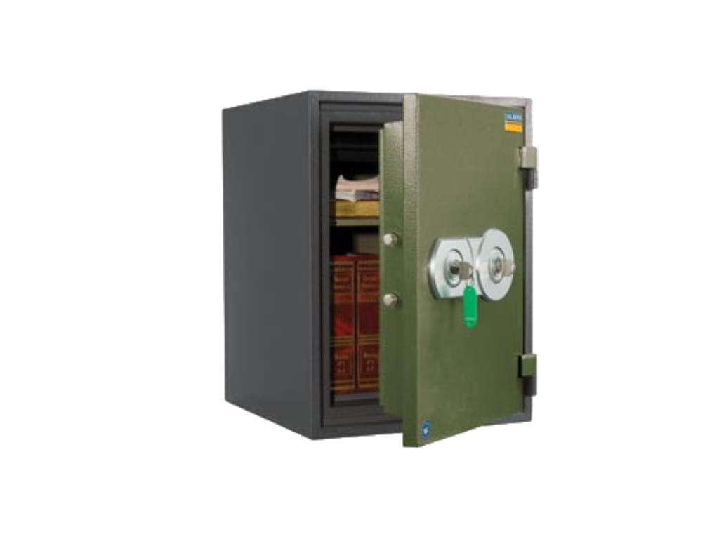 В конструкцията на кутията и врата е използван пълнеж от огнеупорен бетон.Има прахово полимерно покритие. Сейфът е с тристранно заключване, модификация KL - две брави с два различни ключа. Сейфът е снабден със сертификат за пожароустойчивост. Сейфът има само един отвор за монтаж към под.