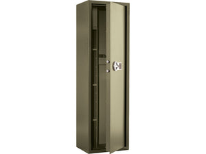 Оръжеен сейф за 4 броя оръжия с електронна брава клас А, масивна стоманена врата 5 мм, корпус 3 мм и вътрешно касово отделение. Изключително надежден, подходящ за сигурно съхранение на оръжие и боеприпаси. Теглото му е 88 кг и позволява фиксиране към под и стена за допълнителна защита. Този сейф предлага съчетание от висока сигурност, удобство и практично вътрешно разпределение. С вместимост до 4 оръжия и 3 рафта за аксесоари, той осигурява достатъчно място за организирано съхранение. Стоманеният корпус с дебелина 3 мм и врата 5 мм предпазват от взлом, а електронната брава PS 300/PS 310, сертифицирана по EN 1300 клас А, гарантира надежден достъп само за оторизирани лица. Вътрешното касово отделение позволява отделно и защитено съхранение на боеприпаси и ценни предмети.Гаранция -2 години.Сейфът се предлага по заявка, след пълно предплащане.