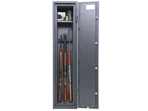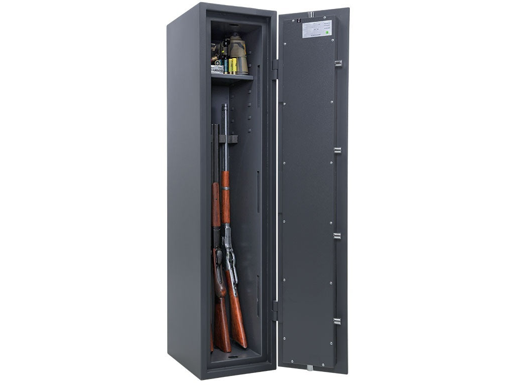 Оръжеен сейф с висока степен на сигурност и огнеупорна защита, подходящ за съхранение на 3 пушки. Предлага надеждна конструкция, защита от взлом и устойчивост при пожар, което го прави идеален избор за ловци и притежатели на оръжие, търсещи максимална сигурност. Огнеупорността е сертифицирана по LFS 30 P EN 15659 и осигурява 30 минути защита при температура до 1000 градуса. Сейфът е с клас 1 по EN 1143-1, гарантиращ висока устойчивост на взлом. Конструкцията е със специален двоен корпус, укрепена защита срещу рязане и разбиване, врата с дебелина 95 мм и стени с дебелина 55 мм. Тристранното заключване със скрит Re-locker механизъм осигурява допълнителна сигурност при опит за насилствено отваряне. Предлага се избор на заключване: механична брава KL KABA MAUER President 71111, клас А по EN 1300, или електронна брава EL MLock AL2020/EM2020, клас B по EN 1300, предлагана като допълнителна опция. Сейфът разполага с фабрични отвори за монтаж към под и стена.Максимална височина на оръжието 1215 мм. Теглото му е 108 кг и е оборудван с 6 заключващи болта. Покритието е прахово полимерно, предлагано в тъмно сив графит RAL 7024 или бял RAL 7035.Гаранция-2години.Сейфът се предлага по заявка, след пълно предплащане.