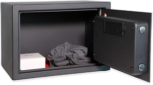 Този сейф осигурява надеждна защита на вашите ценности, документи и лични вещи, благодарение на солидната си конструкция и модерните технологии за сигурност. Стоманената врата с дебелина 4 мм и корпусът със стени 1.5 мм гарантират устойчивост срещу взлом, а електронната брава позволява задаване на персонален код от 3 до 8 цифри за пълен контрол на достъпа. В случай на забравен код, сейфът разполага с аварийно отваряне чрез мастер ключ или авариен код, осигурявайки спокойствие и удобство при всяка ситуация. Прахово-полимерното покритие предпазва от износване и поддържа елегантния му външен вид, а възможността за монтаж към стена или под прави сейфа стабилен и неподвижен. Произведен от реномираната испанска компания "BTV".Подходящ за дома, офиса и хотели, той комбинира функционалност, сигурност и дългосрочна надеждност, подкрепени с гаранция от 2 години.