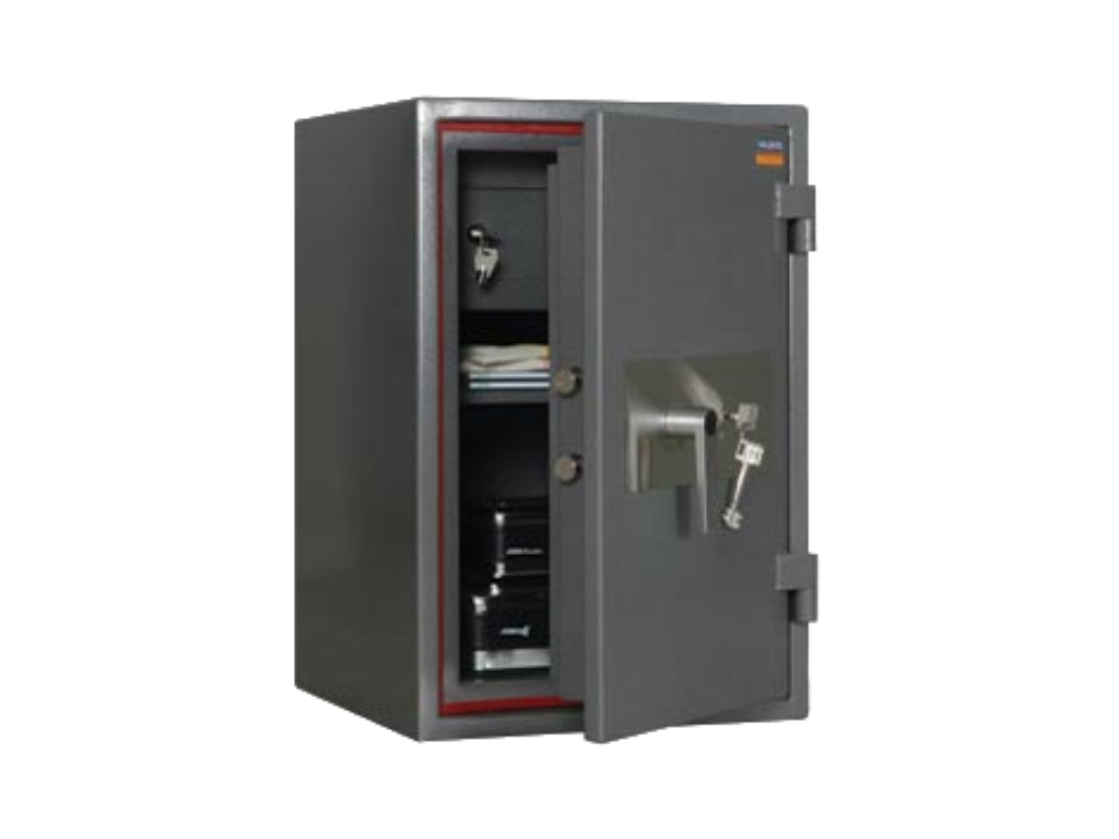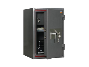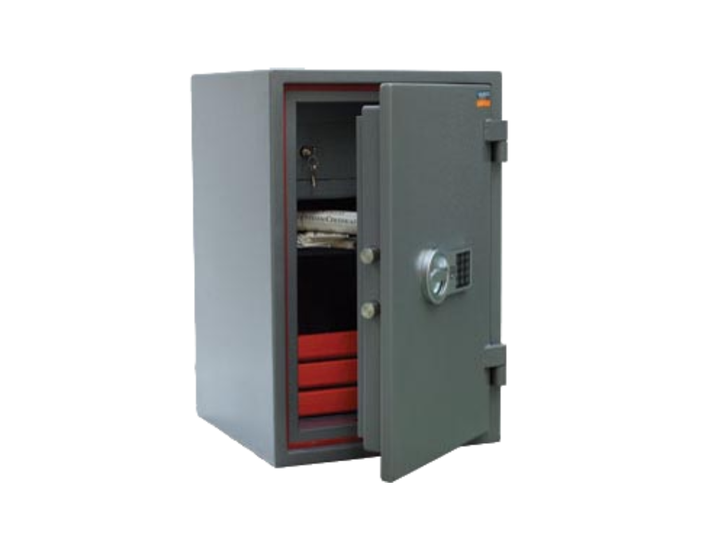 Дебелина на вратата 59 мм. Дебелина на стените: 25 мм.Сейфът е с двоен корпус със специална защита против рязане и разбиване. Тристранно заключване, посредством електронна или механична сейфова брава по избор. Консултирайте се с нас преди да закупите, като се свържете с нас на посочените контакти.Има прахово полимерно покритие и фабричен отвор за монтаж към основа. При закупуване на тази сейфова кутия получавате две (2) години гаранция.