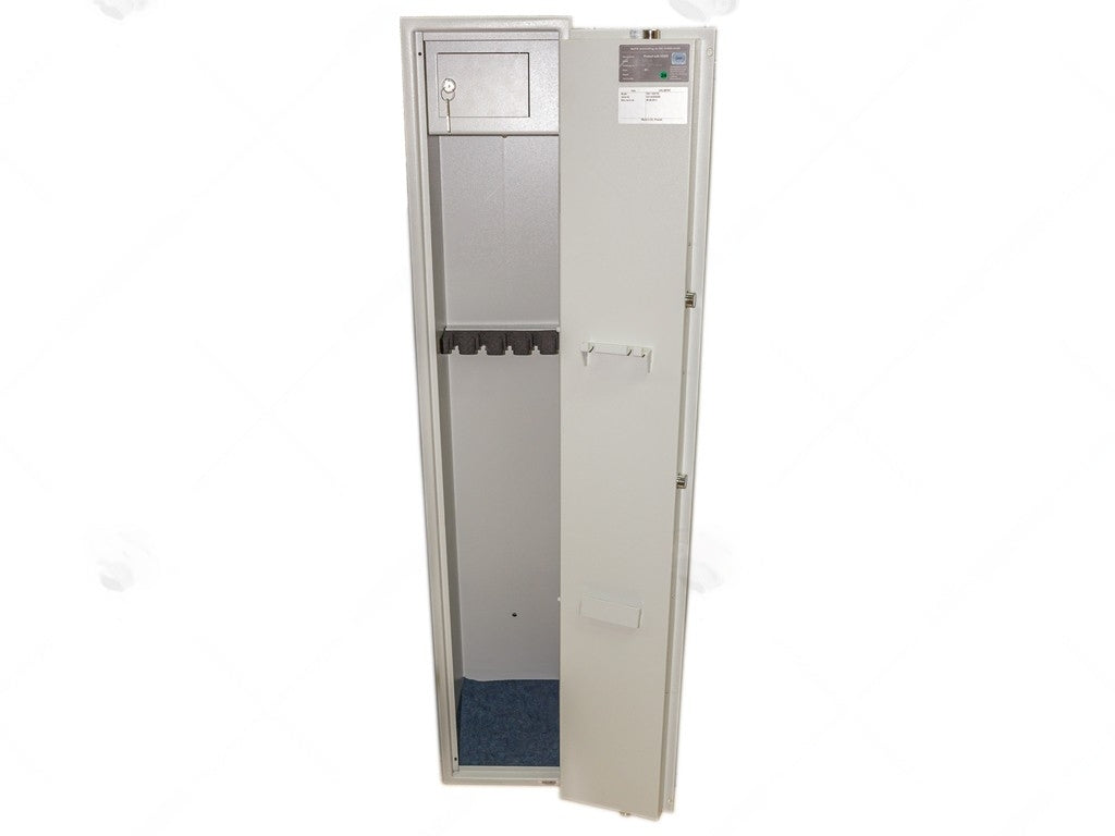 В оръжеен сейф GS1 1423 може да съхранявате до 3 бр оръжие. Сейфът е с тристранна брава MAUER - клас А / Германия /. Има отделение за патрони с ключалка и делители за пушки. Изработен е от стомана с дебелина 2.8мм прахово полимерно боядисване. Вратата е дебела 5см. Отвори на гърба и пода за закрепване.Максимална височина на оръжието – 1290 мм.