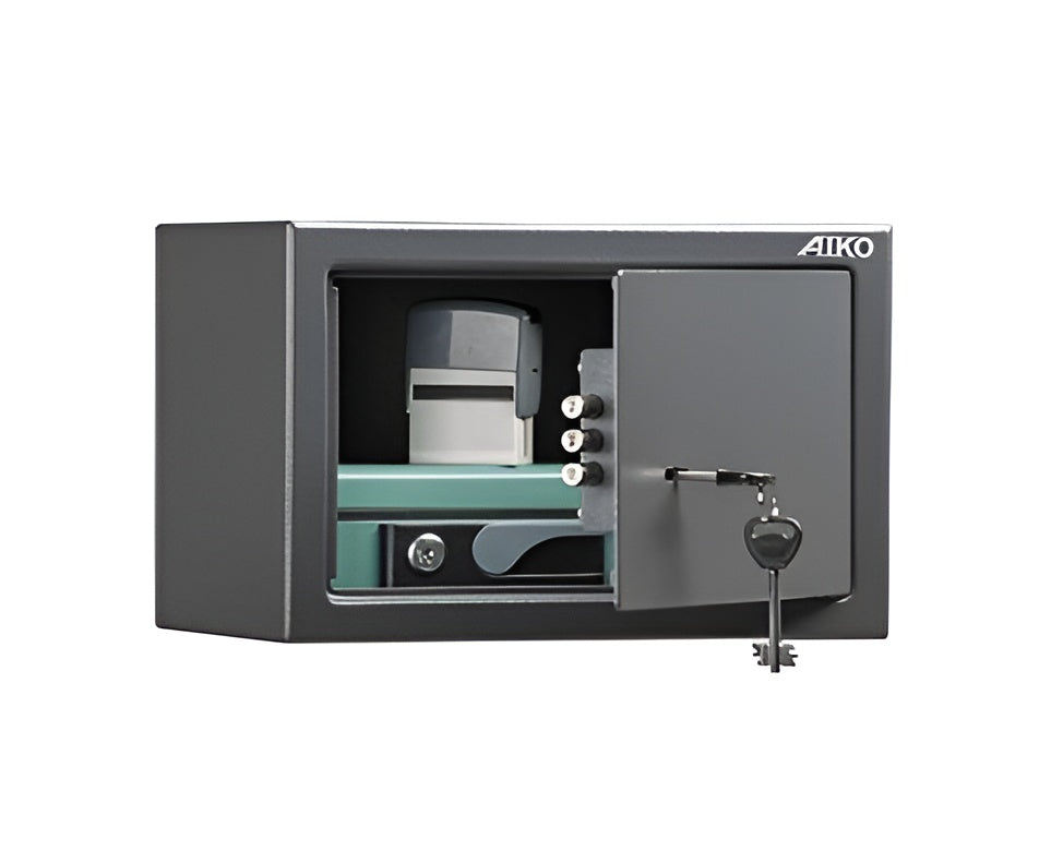 Този сейф е създаден за максимална сигурност и удобство, подходящ за домашен офис и лична употреба. Конструиран чрез щампован стоманен корпус без видими заваръчни съединения, което осигурява по-висока здравина и устойчивост. Подсилената стоманена врата с 2.8 мм плоча гарантира надеждна защита на ценности и документи. Сейфът е оборудван със сигурна сейфова брава, която осигурява стабилно заключване при ежедневна употреба. Предвиден е фабричен отвор за фиксиране към стената, който предотвратява преместване или изнасяне. Праховото полимерно покритие осигурява устойчивост срещу корозия и запазва елегантния външен вид. Предлага се в светлосив или тъмносив цвят според наличностите. Вътрешен обем 8 литра, тегло 5 кг, гаранция 2 години.