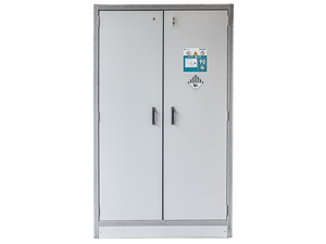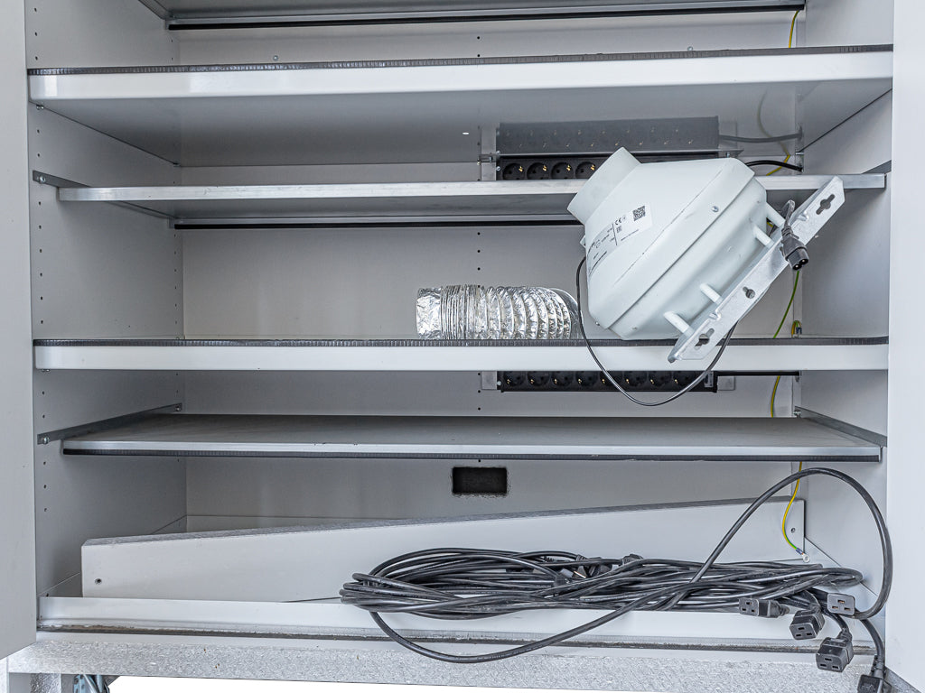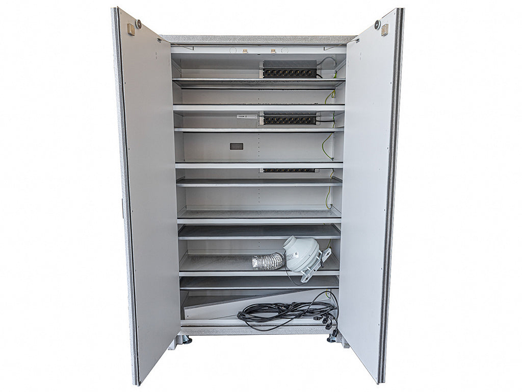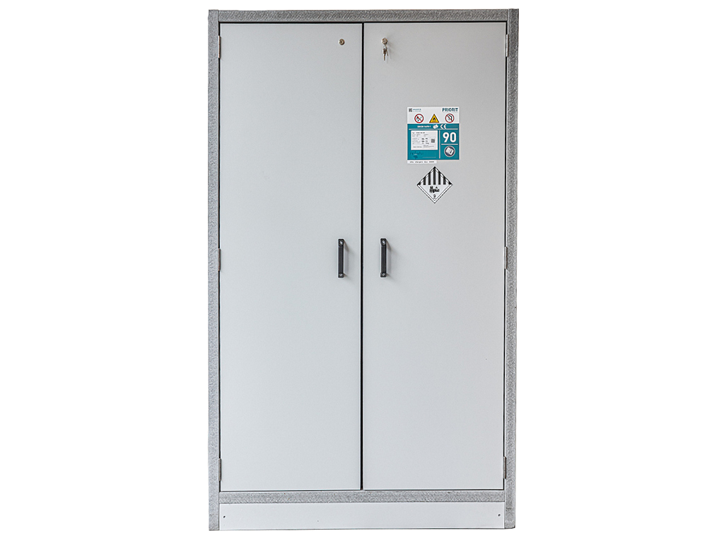 Продуктът е ремаркетиран и е в отлично състояние! PRIORIT PRIOCAB Typ90 (EN92:196-120) LI-ION пожаробезопасен шкаф за зареждане и съхранение на литиево-йонни батерии. GS (geprüfte Sicherheit) сертифициран по DIN EN 14470-1 за пожароустойчивост до 90 минути. Изграден от негорим CP ламинат, с цвят RAL 7035. Разполага с 5 заземени рафта от неръждаема стомана (до 75 кг. товар за всяко) и 5 разклонителя (по 1 за всеки рафт). Всеки разклонител е с по 8 гнезда. Шкафовете предлагат изключително ниво на стабилност и дълъг експлоатационен живот. Качествените повърхности са лесни за почистване. Краката са интегрирани и могат да се регулират отвътре, което улеснява настройването и подравняването на шкафовете. В долната част има специално оставен просвет за товарна количка или мотокар, за улесняване на преместването, въпреки сериозното тегло на продукта. Вратите на предпазните шкафове се затварят автоматично в случай на пожар. Изцяло изграден от един и същ, хомогенен, негорим, не-експлоадиращ материал (клас A2 - S1, D0: не-горим). Включва вентилационен вентилатор, който постоянно регулира температурата в шкафа, през специално изградените отвори в горната и долната част. Линк към страница на производител - https://www.priorit.de/en/products/priocab-typ90-3/