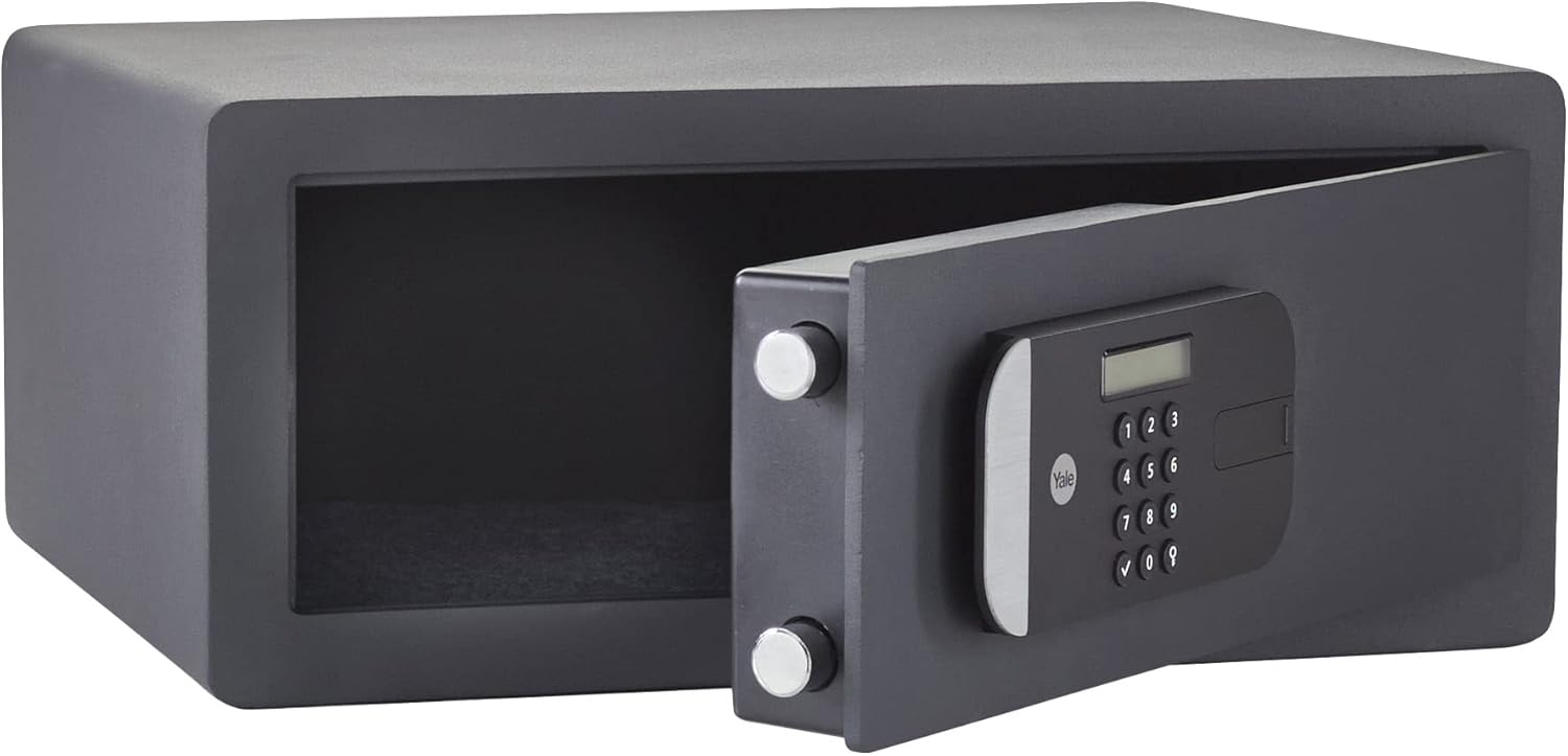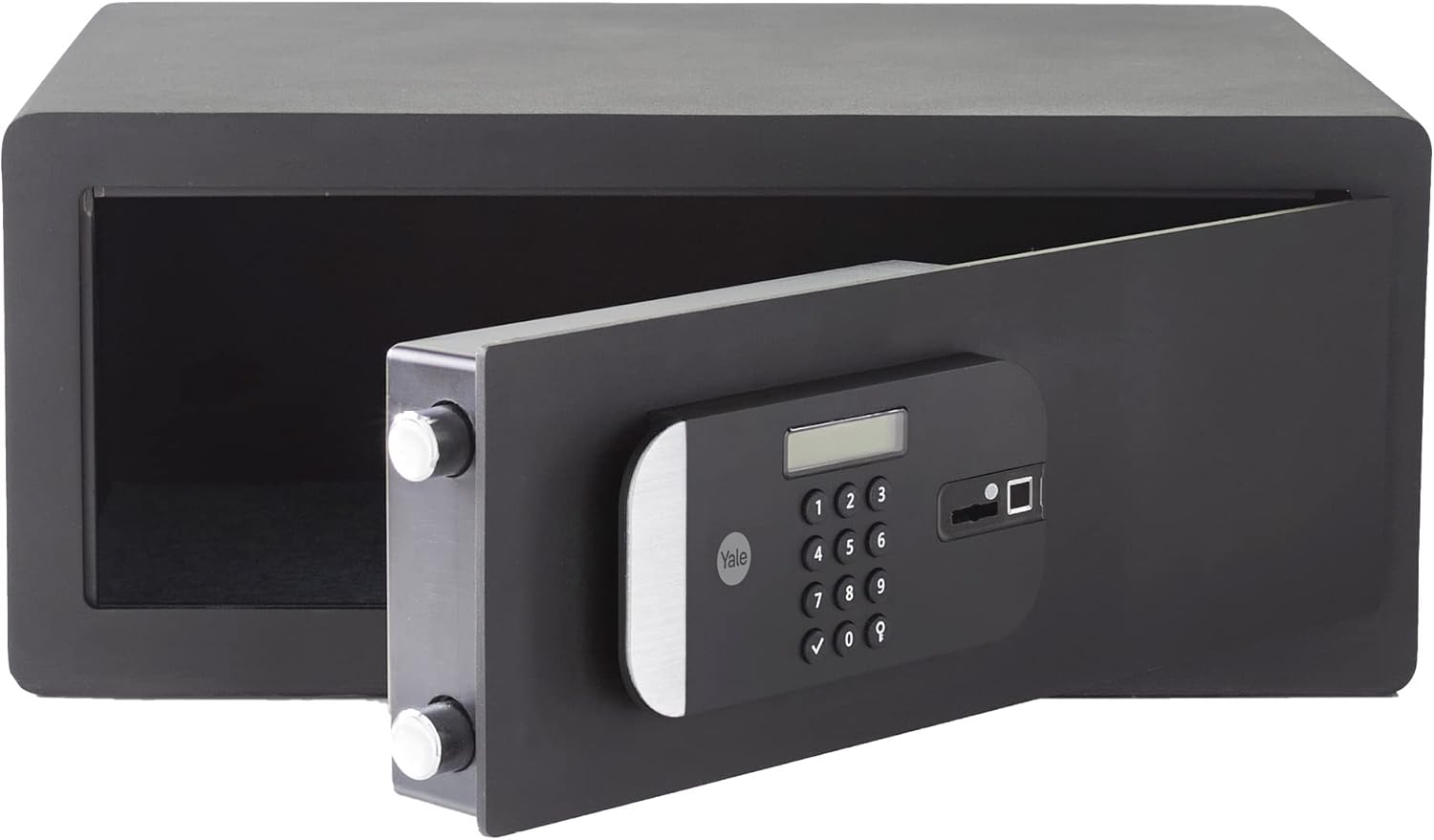 Сейф за лаптоп Yale YLFM/200/EG1 е подходящ за съхранение на лаптоп, документи, ценности и оръжие. Сейфът се заключва посредством електронен код (възможна комбинация от 3 до 8 цифри) или пръстов отпечатък (съхранява до 100 пръстови отпечатъка), или едновременно и двете. Сейфът притежава ключ за аварийно отваряне (1 бр.). Възможност за подаване на ток отвън с батерия 9V.Има отвори за закрепване към пода или стената.Технически данни:- Дебелина на корпуса - 3 мм, дебелина на вратата - 6 мм- Заключването се осъщесвява с 2 хоризонтални шипа по 20 мм- LED диоди за вътрешно осветление- По-солиден корпус, подсилен с бронирана врата от стомана- Електронната брава работи с 4бр. батерии от 1.5 V (АА), включени в окомплектовката на сейфа